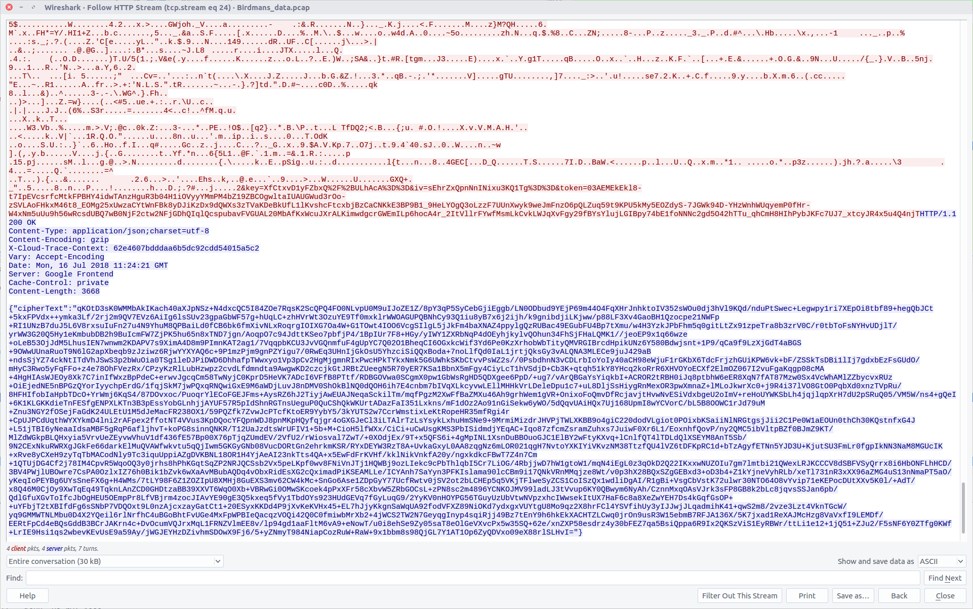 Reading to the end of the traffic sent by decrypttool.exe (TCP Stream #4082) we can see the final message left for the investigators.