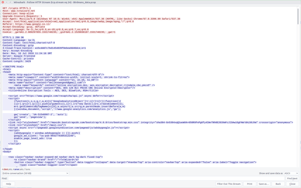 We know that the TufMups found out about K3anu’s real identity, and that K3anu downloaded an executable that connects back to the TufMups server on an unusual port. Let’s see if there is anything in the PCAP to shed light on what the TufMups found.