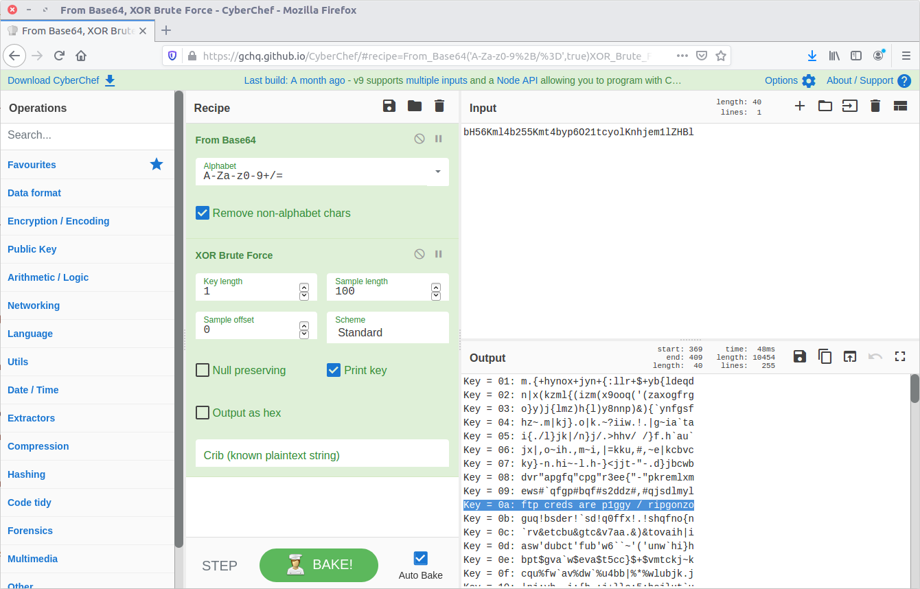 Maybe it is encrypted rather as well as encoded. CyberChef has a collection of cipher functions that we can try, including an XOR Brute Force module. By default the module will attempt single-byte keys and display the output.