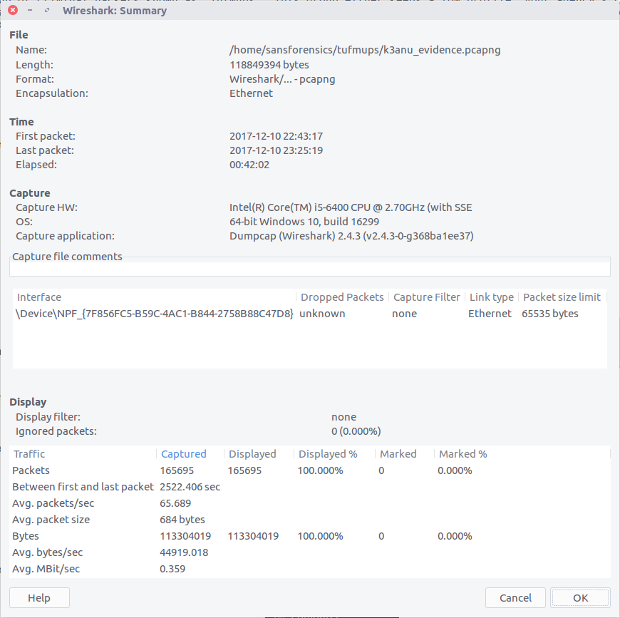 After extracting the PCAP file and opening it in Wireshark, we can bring up the Summary window to find the start and end time of the capture. One thing I’m not sure about is the timezone – it’s not explicitly specified. My SIFT VM and Wireshark are both set to UTC so let’s assume that for now.