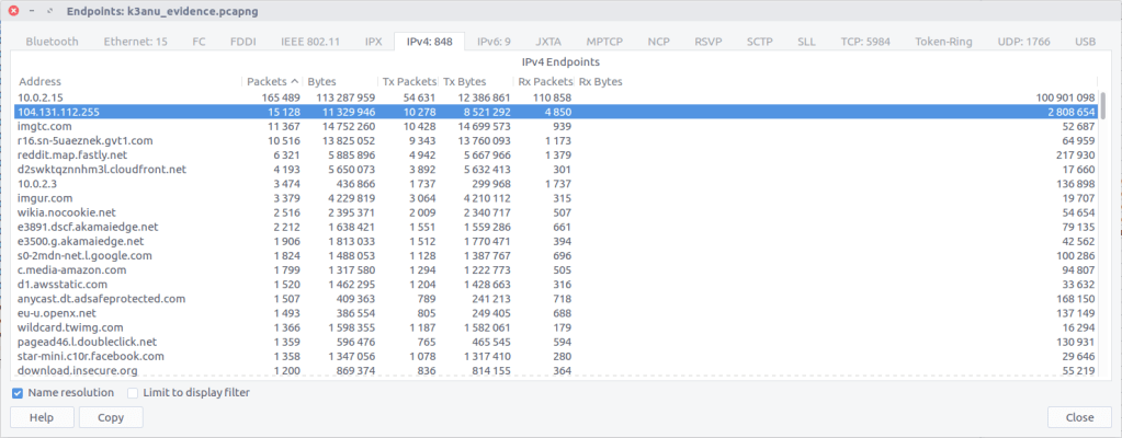 Using the Endpoints screen we can quickly summarise the traffic sent between each IP address in the capture. We know from the provided screenshot that the server we are interested in has the IP address 104.131.112.255
