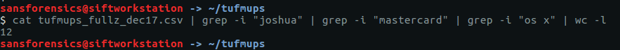 cat tufmups_fullz_dec17.csv | grep -i "joshua" | grep -i "mastercard" | grep -i "os x" | wc -l