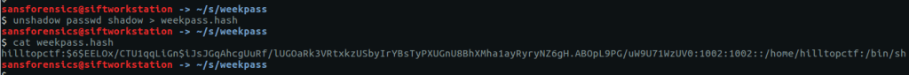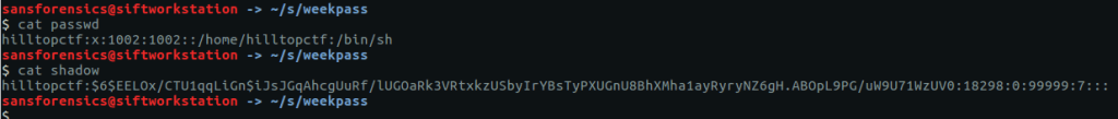 unshadow passwd shadow > weekpass.hash cat weekpass.hash
