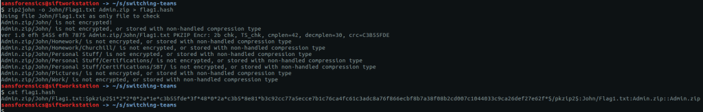 zip2john -o John/Flag1.txt Admin.zip > flag1.hash cat flag1.hash
