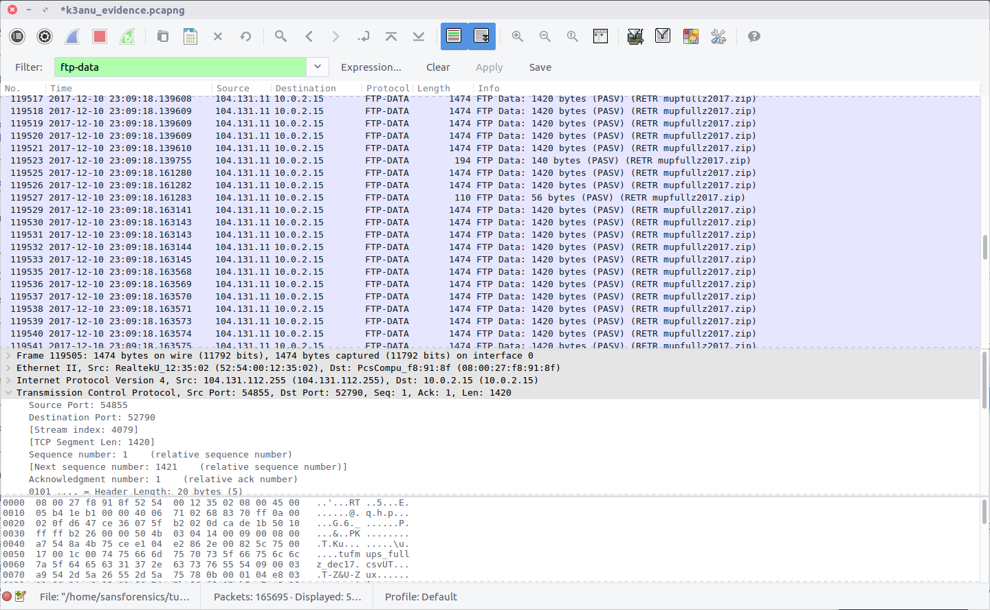 Filter on ftp-data to show the file transfer traffic, then follow the TCP Stream for the ZIP file (#4079)