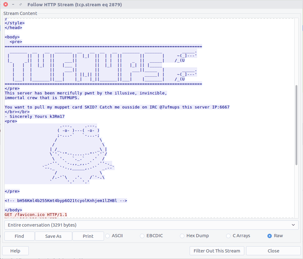 By filtering on HTTP traffic between K3anu’s system and the TufMups server, and following the HTTP Stream (#2879), we can see the HTML source including an interesting comment.