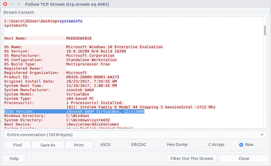 We can use the same TCP Stream (#4082) to answer the next few questions as well. The output of the systeminfo command lists the exact BIOS version.