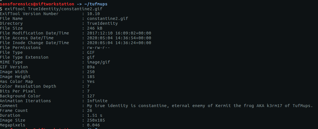 The trueidentity.zip file contains three images. Once again, the EXIF data reveals more clues about K3anu’s identity. Examining constantine2.gif give us the following.
