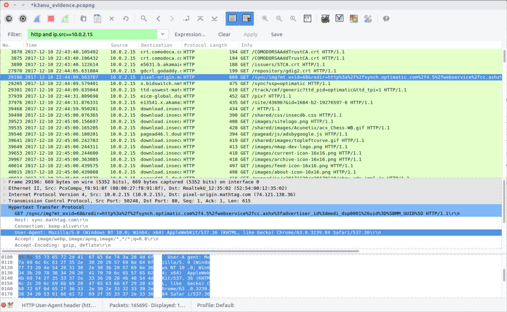 We can find the web browser user-agent string by filtering for HTTP requests made by K3anu’s system: