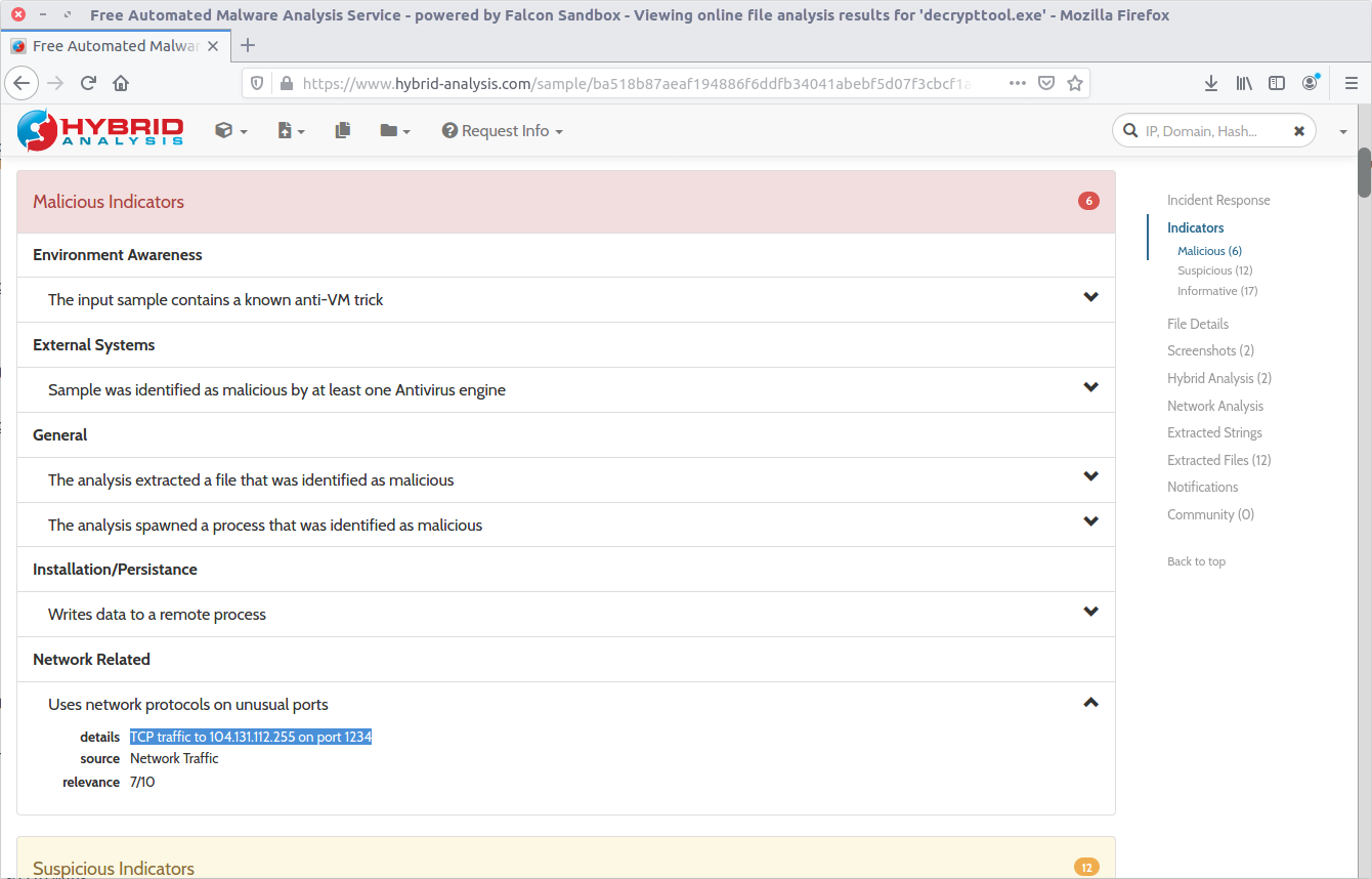 There are a few ways to tackle this now that we have the binary. If you have a Windows VM set up for malware analysis you could just execute the binary and track its activity. Instead, I calculated the MD5 hash (20422a060c5f8ee5e2c3ba3329de514f) and searched a public online sandbox for a quick win.