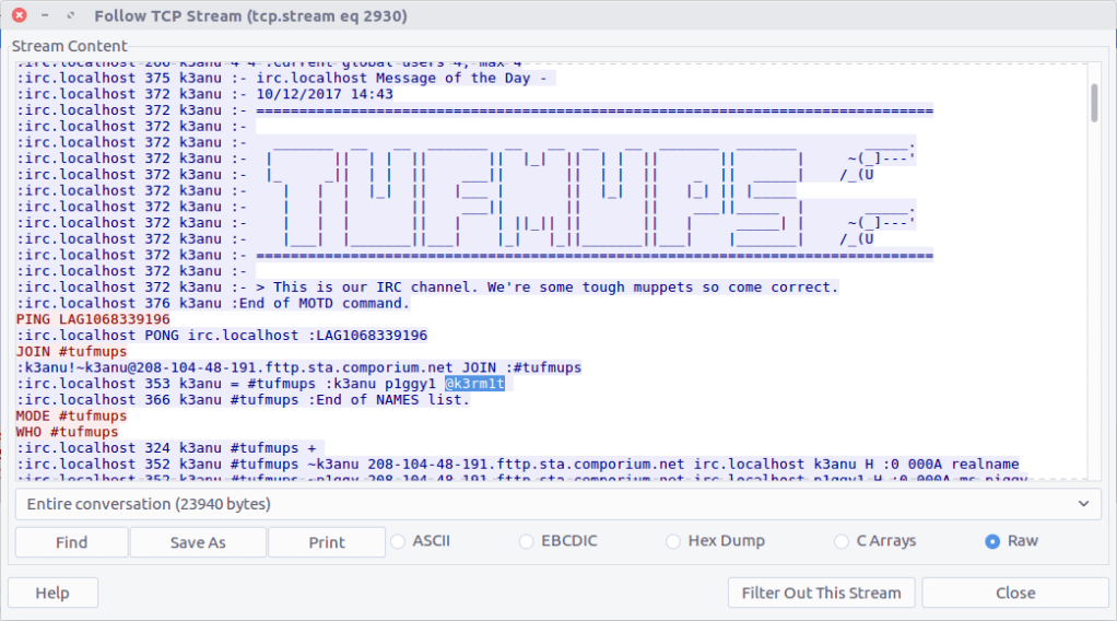 Similarly, we can filter on IRC traffic and follow the TCP Stream (#2930) for easier reading.