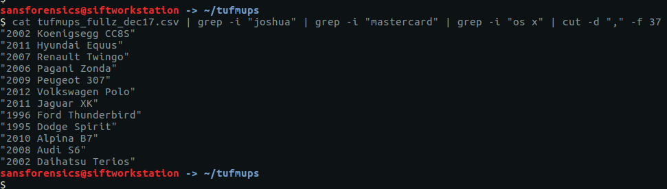 cat tufmups_fullz_dec17.csv | grep -i "joshua" | grep -i "mastercard" | grep -i "os x" | cut -d "," -f 37