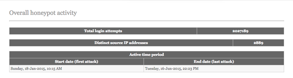 Until last week when I logged into the VPS for the first time in close to six months, noticed a suspiciously large number of SSH connections, and after a brief moment of panic, realised I had six months of honeypot data to play with! The excitement didn’t last very long.